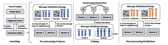 The scalable GNN search space consists of the definitions of steps and the algorithm selection range. The whole search system is divided into two parts: search engine and evaluation engine. The search part uses the multi-objective search algorithm based on Bayesian optimization. The suggestion server models the relationship each architecture instance and its objective values based on the historical observation data, randomly samples a number of new instances, and suggests the best one which maximizes the EHVI for the evaluation engine. The evaluation engine evaluates the sample model architecture, and feeds back the result and observation indicators to the search engine to update the historical observation data. To accelerate the search process, the evaluation engine is divided into two parts: graph data aggregator and neural architecture trainer. The engine also performs distributed storage and computing. The only difference between pre- and post-processing is that the features of input nodes are different. Graph data is divided into batches and sent to workers for parallel computing. The calculation results of each step are stored on workers in a distributed manner. Then, the result of a hop is obtained as the input. The distributed parallel computing greatly reduces calculation time. The neural architecture trainer part is the same as the distributed training based on the parameter server of other deep learning methods.