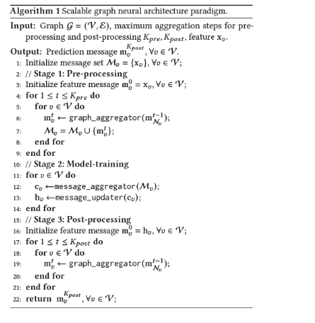 This blog divides the process of the message spreading into three phases: pre-processing, model training, and post-processing. Pre-processing aggregates data based on graph structure by obtaining features from neighborhood nodes which are not limited to the 1-hop neighbors. Instead, neighborhood features in a large range can be aggregated in multiple manners such as randomwalk, pagerank, and adaptation, striking a balance of information between lower-order neighbors and higher-order neighbors. Model training combines and converts pre-processed neighborhood features to generate feature vectors of each node. The aggregated features in the last step may be directly obtained without the multi-step combination of neighborhood aggregated features. Here, Multi-layer Perceptron (MLP) is used for conversion. Post-processing is similar to label propagation. The features trained by the model are aggregated in the neighborhood again to generate prediction features. Different from the message passing mechanism, in this paradigm feature aggregation and parameter training are independent of each other, providing high scalability and acceleration during training. In addition, unlike many GNN networks that use only the last aggregated features, the combination mechanism of neighborhood features can combine low-order and extended neighborhood messages. The paper experiment also proves that the post-processing process can improve the model stage.