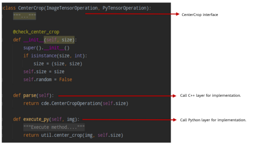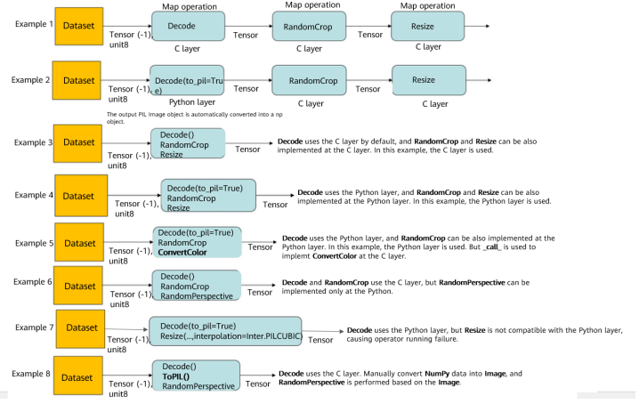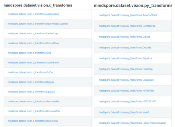 With the preceding framework capabilities, map can call operators at the C layer and Python functions. Based on this feature, we created two sets of vision data preprocessing interfaces.