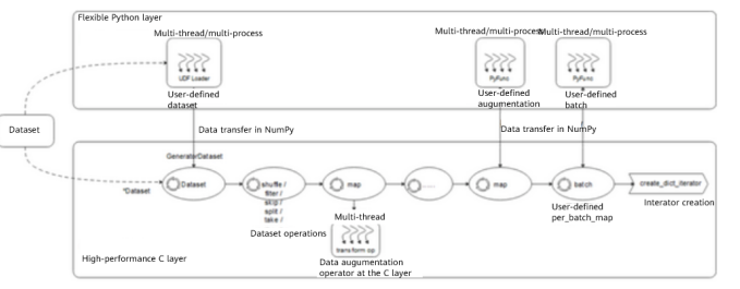 (3) As an execution module, map calls data preprocessing operators at the C layer, such as Decode, Resize, Crop, Normalize, HWC2CHW. It also implements the user-defined PyFunc augmentation with input and output being NumPy data.