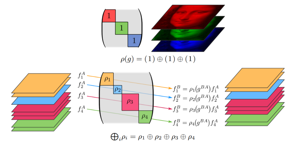 For example, in the following figure, a feature of a point in the image is three values (R, G, and B), that is, a direct sum of three scalars. The scalar here is the trivial representation of the transformation group, and its value remains unchanged under the action of the transformation group. Trivial representation means that for any transformation group, the representation mapping maps it to an identity matrix, which means that the symmetry information is lost in the mapping process. If the neural network is required to maintain a certain degree of symmetry, we need to describe the transformation of the feature field with a nontrivial representation, indicating that there is a submatrix whose dimension is greater than 1 in the direct sum decomposition of the matrix. Therefore, the neural network is a mapping in which each piece of the submatrix maintains symmetry, as shown in Figure 2.