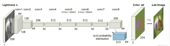 The main principle of the algorithm is as follows: Feed the L channel of a grayscale image in LAB color space into the model to infer the AB channel, and then combine the original L channel with the inferred AB channel to obtain a colored image.
