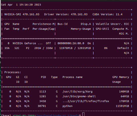 Check the GPU status. The power is 200 W, and the memory usage is approximately 12 GB.