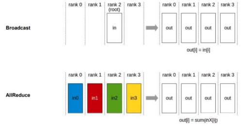 Data parallelism depends on collective communication. The preceding example uses the Broadcast and AllReduce communication primitives. Broadcast distributes data to different devices, while AllReduce aggregates gradients from different devices.