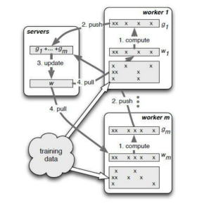 The preceding operators process data in synchronous mode, where model parameters are updated after gradient aggregation of different devices and then a new round of training is started. Conversely, the asynchronous mode updates model weights and parameters asynchronously, that is, workers on a single device does not need to wait for other workers, and the next round of training can be started after gradient aggregation and parameter update. A typical application of the asynchronous mode is the parameter server architecture. Specifically, a parameter server manages model weights, continuously updates the model based on worker training gradients, and pushes a new model to workers to start a next round of training.