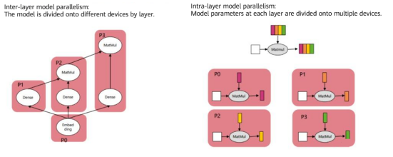 As shown on the left, network models vary with different devices in the inter-layer parallel mode. For example, the embedding layer is executed on P0, and P1, P2, and P3 are used to calculate the subsequent fully connected layers. On the contrary, intra-layer parallelism does not change the network structure. Instead, the model parameters of each layer are divided onto different devices for parallel processing. As shown on the right, the matrix calculation of each layer is divided onto devices P0 to P3. 04 Cases Most AI frameworks supports distributed parallelism. For example, the MindSpore framework supports data parallelism, model parallelism, and hybrid parallelism. For model parallelism, the framework supports automatic, semi-automatic, and manual modes according to actual situations. On MindSpore, different parallel strategies can be set using the context module: