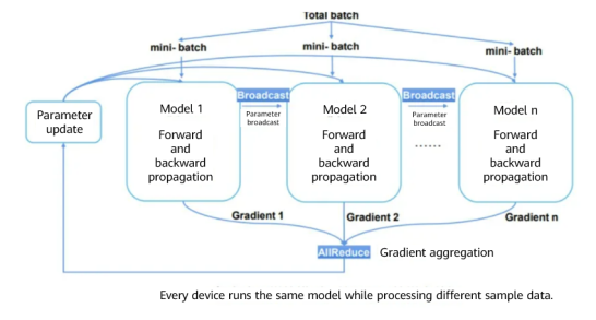 Assume eight GPUs or Ascend NPUs are used to train an image classification model and the training data is split into 160 batches. The number of batches (min-batch) allocated to each device is 20, and each device completes training based on the allocated sample data. The obtained gradients vary with different data samples on devices. Therefore, the gradients need to be aggregated (summing and averaging) to ensure that the result is the same as that of single-device training. Then, the parameters are updated.