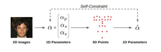 A representation cycle is created from the overall framework. First, the image encoder and the independent decoder regress the 1D parameters from the face image input. Construct a 3D grid according to the parameters and refine extracted 3D landmarks. In this step, 1D parameters are converted into 3D point representations in a forward direction. For the backward representation, a landmark is employed to the 3DMM module, switching from 3D points back to 1D parameters. Thus, a representation cycle is formed (Figure 4). We minimize the consistency loss to facilitate training.