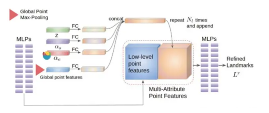The refinement module is not improved using LC alone. Instead, multi-attribute feature aggregation (MAFA) is applied, covering input images and 3DMM semantics to provide information from different domains. For example, the shape contains information about the face thickness, and the expression contains information about eyebrows or oral movement. Such information can help regress a better landmark structure. MLPs are usually used to extract features from structured points. At bottlenecks, global point max-pooling is used to obtain global point features. The MLP decoder is then used to regress the attributes of each point.