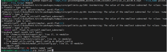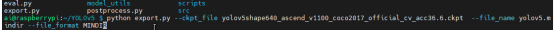 export.py --ckpt_file yolov5shape640_ascend_v1100_coco2017_official_cv_acc36.6.ckpt --file_name yolov5.mindir --file_format MINDIR