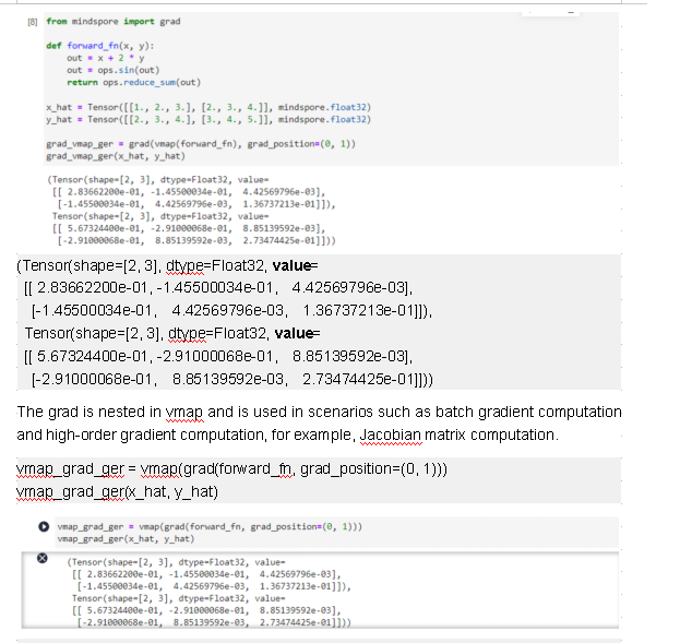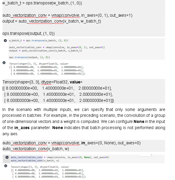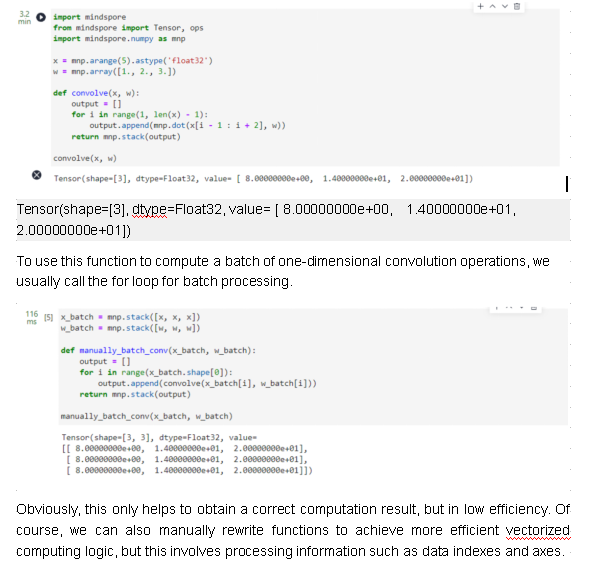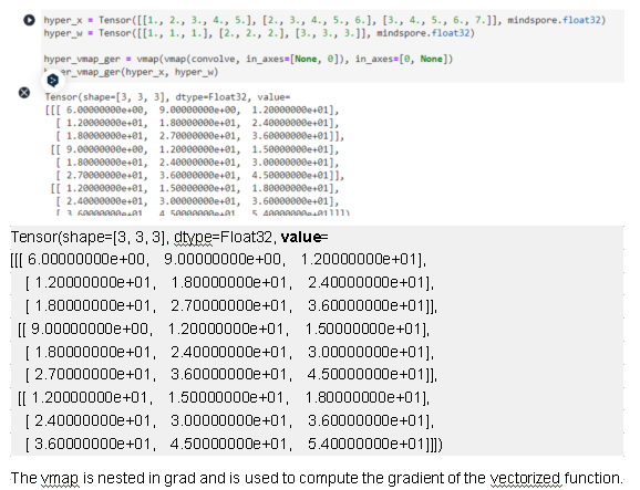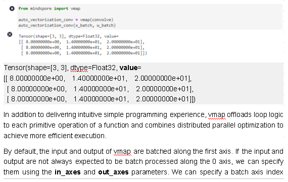 The vigorous development of AI converged computing poses new requirements and challenges to framework capabilities. Problem scenarios and model design become increasingly complex, making the service data dimensions and the nesting depth of computing logic increase accordingly. Even if the vectorization optimization method can effectively resolve performance bottlenecks, it is not easy for common users to implement. It might be easy to implement low-dimensional data operations. However, as the data dimensions increase, the service logic becomes more complex, which requires us to clearly understand the logic mapping between data dimensions of operations, bringing great challenges to model design and coding. The automatic vectorization feature, vmap, helps solve this problem, which allows us to separate specific batch processing logic from functions. When writing a function, we only need to consider the low-dimensional operation logic. The vmap API is called to automatically implement high-dimensional operation. In addition, nested calling is supported, which effectively reduces problem complexity.