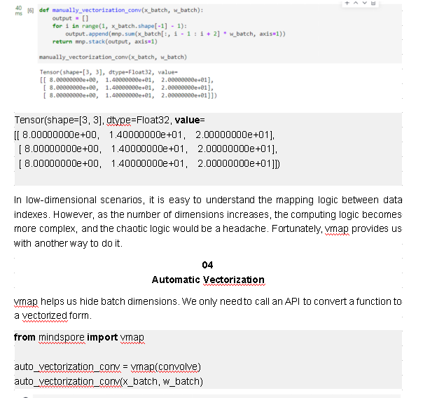 This blog describes how to use the vmap API to convert highly repeated operation logic in models or functions into parallel vector operation logic, achieving simplified code logic and efficient execution performance.