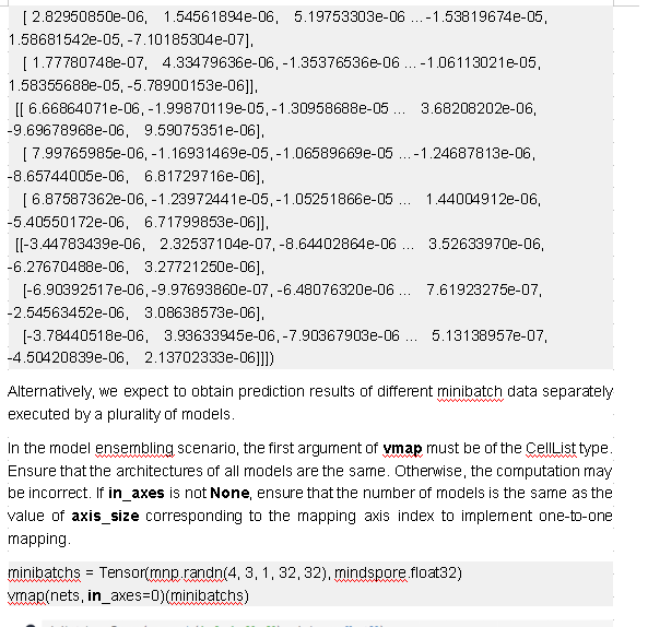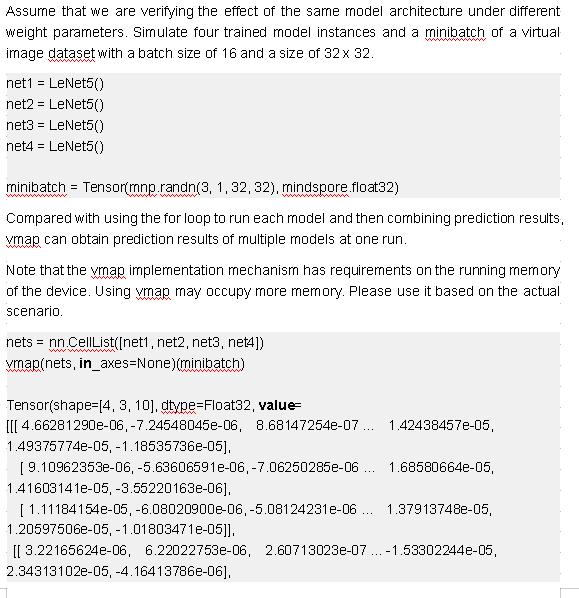 In this scenario, vectorization of weight data is involved. If the running model is implemented through functional programming, that is, weight parameters are defined outside the model and transferred to the model through arguments, you can directly configure in_axes to perform batch processing. MindSpore provides convenient model definitions in that the weight parameters of most neural network (NN) APIs are internally defined and initialized. This means that the weight parameters in the model cannot be processed in batches in the original vmap API. Therefore, extra workload is required for reconstructing the model to a function that is transferred through arguments. Fortunately, the vmap API of MindSpore has optimized this scenario for you. You only need to transfer multiple running model instances to the vmap API in CellList format. Then the framework can automatically implement batch processing of weight parameters.