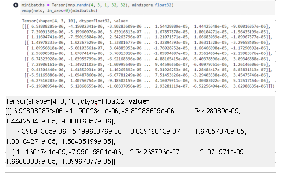 In this way, batch input can be used for training or inference on the same model. Compared with the existing network model input that supports batch axis input, the batch processing dimension implemented by using vmap is more flexible and is not limited to input formats such as NCHW.