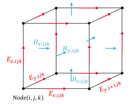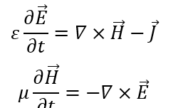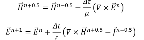 Numerical solution requires us to discretize the equations by processing partial time derivatives first. FDTD alternately updates electric fields and magnetic fields in a leapfrog manner, which generates the following time-stepping formats: