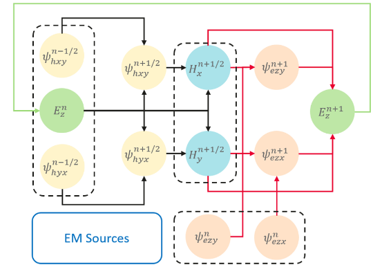 A process of updating electromagnetic fields according to the foregoing formulas can be seen as a recurrent neural network (RNN).