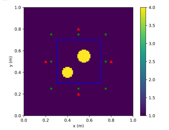 The entire simulation area is divided into 100 x 100 grids, and the 40 x 40 grids (blue square) are used as the optimization area. Four excitation sources (red triangles) and eight observation points (green dots) are set outside the optimization area. The inversion targets are two dielectrics with relative dielectric constant being 4.