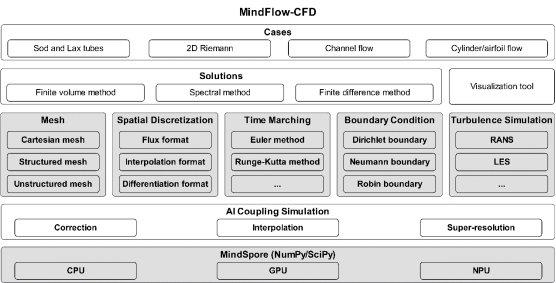 The following figure shows the overall MindFlow-CFD planning, which aims to provide an end-to-end differentiable solution suite for viscous compressible flows. To improve solution efficiency, we use the JIT acceleration feature of MindSpore to compile the solution of each step to a computational graph and perform simulation by combining dynamic and static graphs. In this way, the simulation efficiency is improved. The code of MindFlow-CFD has been released on Gitee.