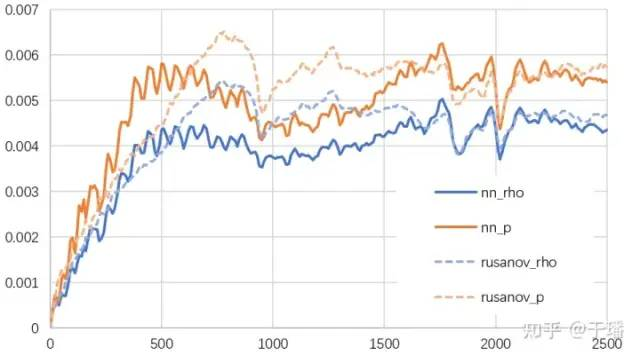The training uses the data of the first 1000 time steps to infer the flow field changes of the entire 2500 time steps. The following figure shows the relative L1loss of density and pressure. Compared with the traditional Rusanov flux, the relative error of fusion calculation is smaller and more stable in long-term predictions.