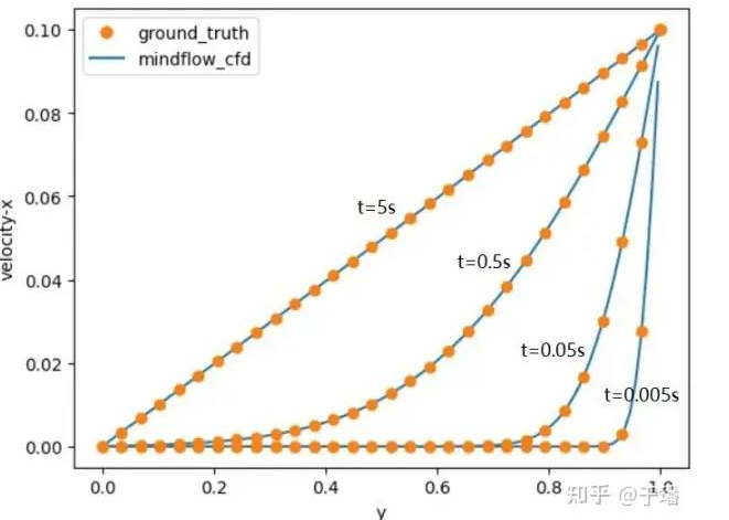 The following figure shows the final iteration result. The speed distribution in the x direction at different moments is shown in the figure, which is consistent with the related theories.