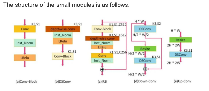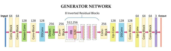 The function of generator G is to transform real-life photos into animation-style images. In practice, this is implemented by the convolution, depthwise separable convolution, IRBs, and upsampling and downsampling modules. The network architecture is as follows.