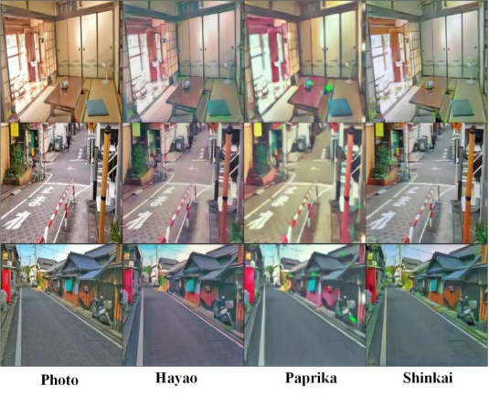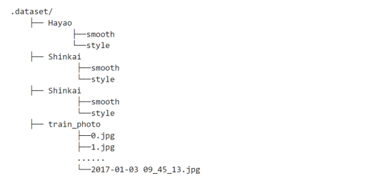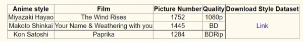 The dataset contains 6656 real landscape images and three animation styles: Hayao, Shinkai, Paprika. Each animation style is generated by randomly cropping video frames from the corresponding movie. In addition, the dataset also includes various sizes of images for testing purposes. The following figure shows the dataset information.
