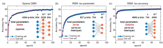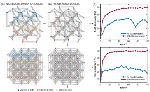 When a Boltzmann network model is trained on a given sparse network, the graph distance between visible, hidden, and label nodes becomes very important. Generally, if layers are fully connected, the graph distance between any given two nodes is a constant. However, this is not the case for sparse graphs. That's why the positions of visible, hidden, and label p-bits matter. If visible, hidden, and label p-bits are clustered and too close, the classification precision is greatly affected. This is likely because long graphic distance between the label bit and the visible bit weakens the correlation between the bits. This problem can be alleviated through p-bits index randomization.
