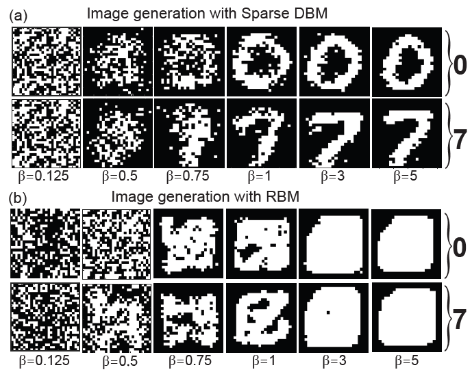 Image generation: Fix the label p-bits is into the code corresponding to the label to be generated, and then perform MC sampling. During the sampling, the network is annealed (from 0 to 5 with a step of 0.125). Visible p-bits corresponding to the obtained sample are the generated image.