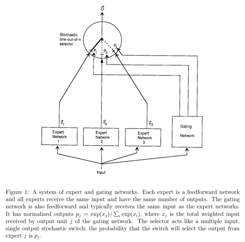 MoE is a practical technology that was born more than 30 years ago. Early MoE was more like ensemble learning, that is, using multiple models to improve task performance. Many natural subsets in real-life data distribution, such as different domains, topics, languages, and modalities. When a single model is used for learning and the model capacity is small, different subsets are like noises that interfere with model fitting. As a result, model training is slow and generalization is difficult. The idea of MoE is to construct multiple models (each model is called an expert) and distribute data of different subsets to different models for training, preventing samples of different types from interfering with each other. The following figure shows the typical MoE network[2].
