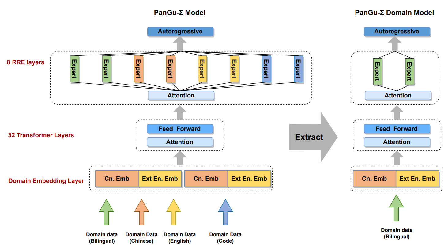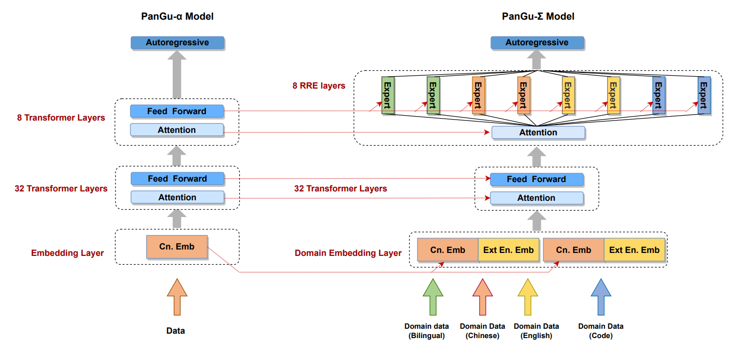 PanGu-Σ [8], released in March this year, is a lifelong learning MoE model developed by Huawei Noah's Ark Laboratory based on the PanGu-alpha model. It proposes a random routing expert (RRE) method, so that the gating network can also be tailored with the experts. The following figure shows the PanGu-Σ structure.