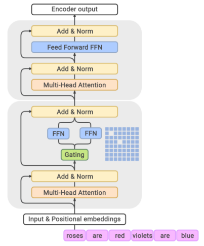 In the GLaM diagram above, every other feed-forward network layer in the encoder and decoder of Transformer is replaced with a position-wise Moe layer. The gating network uses a top-2 route to select the two experts with the highest probability.