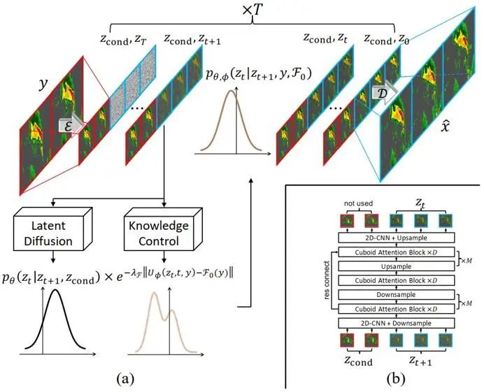 Based on the training idea of the latent diffusion model, PreDiff is first trained on radar echo data based on the VAE, to obtain an encoder E and a decoder D. The encoder E encodes the observation sequence y into a latent context zcond. The latent diffusion model then generates the prediction result z0 by autoregressively denoising Gaussian noise zT conditioned on zcond. The transition distribution of each step from zt+1 to zt can be further refined via knowledge control, according to auxiliary prior knowledge. z0 is decoded back to pixel space by the decoder D to produce the final prediction xb. In addition, the Earthformer-UNet architecture is used in PreDiff.