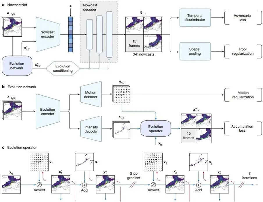 NowcastNet is a precipitation nowcasting model proposed by Shengming Long's team at Tsinghua University and the National Meteorological Center of China. The model has been published in Nature. NowcastNet is a deep learning model for nowcasting extreme precipitation. It unifies the physical evolution equation and generative model into one framework to optimize the end-to-end nowcasting of precipitation. NowcastNet produces precipitation nowcasts with sharp multiscale patterns with lead times of up to 3 hours. In a systematic evaluation by 62 professional meteorologists from across China, the model ranks first in 71% of cases against the leading methods. The following figure shows the model structure.