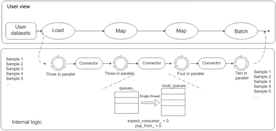 As shown in the figure, the data engine is designed in pipeline mode[1], which is similar to TensorFlow and PyTorch Map-style Datasets and is mainly used for high-performance data processing.