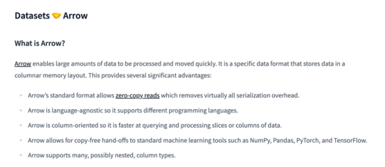 The Apache Arrow format used by HuggingFace has the following advantages: