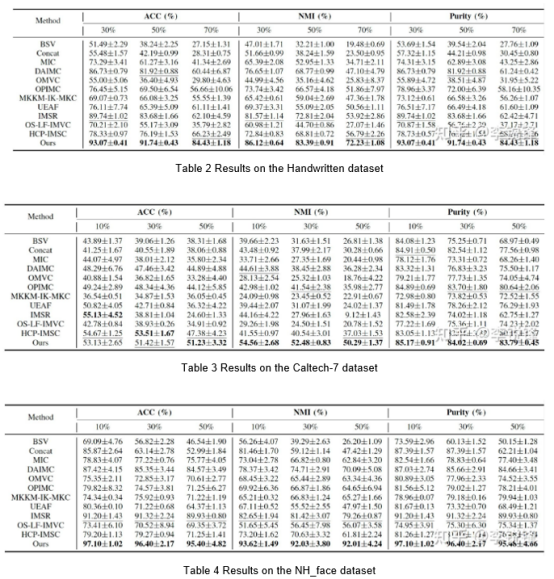 The results in Table 2 to Table 6 show that the approach proposed in the paper delivers relatively good clustering performance under different missing rates. In addition, it can be observed that higher missing rates lead to worse outcomes of incomplete multi-view clustering.