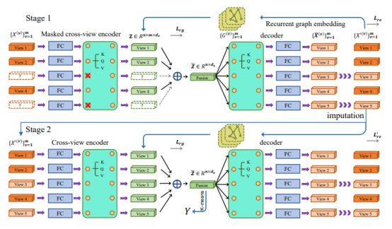 It should be noted that the input of the transformer encoder in stage 1 is oriented to incomplete data. Therefore, a mask mechanism is introduced to mask the impact of the missing view in the process of calculating the attention score, so that the attention score between views focuses only on the available views. Then, the output of the transformer encoder is fused into a feature by using a multi-view weighted fusion strategy, so that a fusion representation of multiple views of the sample is obtained. At this point, the encoding process ends, and accordingly, the authors design a set of symmetric decoders for restoring the fused representation to the original feature space. During decoding, features in missing views are no longer masked, so that the decoder preliminarily restores missing data according to a mapping from a fusion feature.