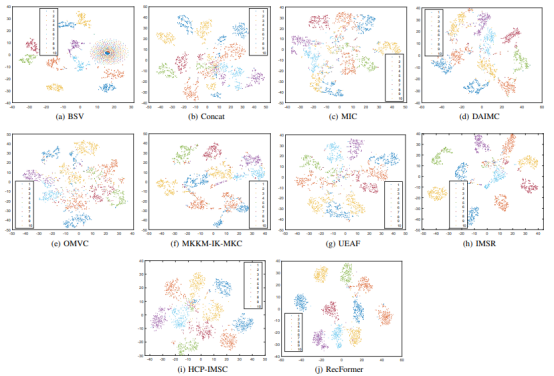 After the feature space of final clustering representations is visualized via t-distributed stochastic neighbor embedding (t-SNE), it is proved that RecFormer boasts higher clustering performance than other state-of-the-art methods.