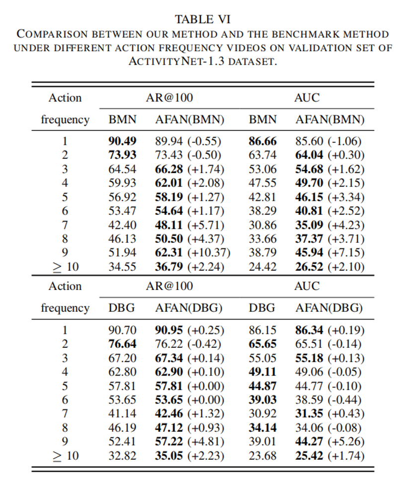 Experimental results show that AFAN can effectively improve the performance of existing TAPG methods. AFAN(BMN) outperforms the benchmark method BMN by 1.06% and 1.43% in terms of the Area Under the average recall versus average number of proposals per video Curve (AUC) on the validation and test sets of ActivityNet-1.3, respectively. To further validate the effectiveness of our method, we also perform verification based on the advanced TAPG method DBG. DBG produces start, end, and action confidence maps at the same time to evaluate all action proposals, and can generate more flexible action proposals compared with BMN. With DBG, a better action proposal generator, AFAN(DBG) achieves higher performance on the ActivityNet-1.3 dataset.