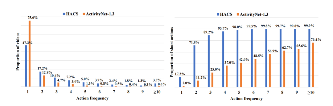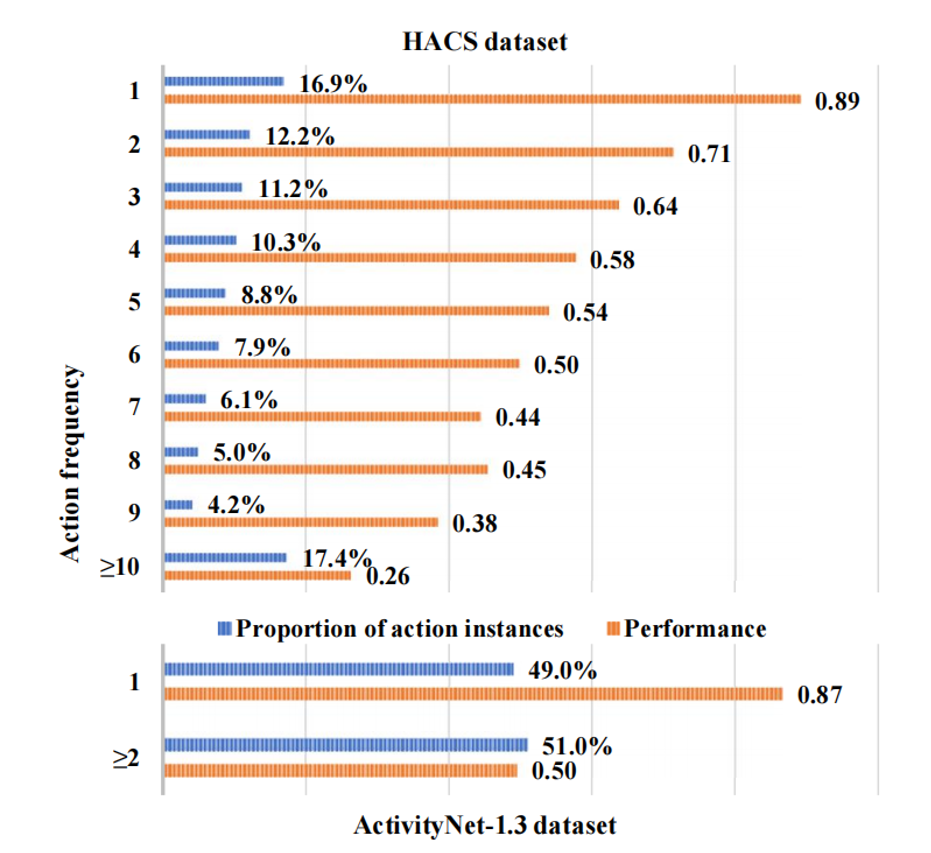 2. A large number of short actions limit the performance with high-action-frequency videos. There are more short action instances in high-action-frequency videos than in low-action-frequency videos. It is difficult to locate these short action instances, similar to small objects in object detection.