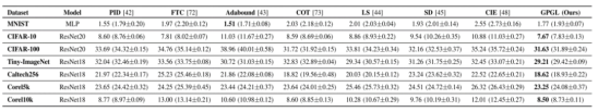 The authors conducted a comparison between the GPGL method and several state-of-the-art optimization strategies, including PID, FTC, COT, Adabound, LS, SD, and CIE, on seven datasets. The result is shown in table 1, where the numbers represent error rates (%). The GPGL method outperforms the state-of-the-art optimization methods by an average of 2.07% on six datasets, with the exception of MNIST. For CIFAR-100, Tiny-ImageNet, and Caltech-256 datasets, the GPGL performance is on average 3.15%, 3.05%, and 3.33% higher than the other four optimization methods. Compared with the second-best performing COT method, the GPGL method improves the accuracy by an average of 0.92%. For the CIFAR-100 dataset, the GPGL performance is 7.33% higher than Adabound.