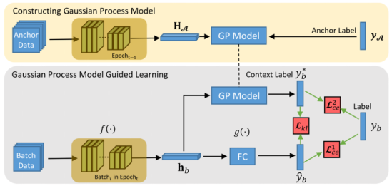 To represent the correlation between the batch-level distribution and global data distribution, a novel learning scheme called epoch-evolving GPGL is proposed in this paper. Its overall framework is shown in figure 1, which consists of GP model construction (at the top) and GP model guided learning (at the bottom). (GP is short for Gaussian process. It is a global distribution-aware learning, nonparametric modeling, and top-down strategy.)