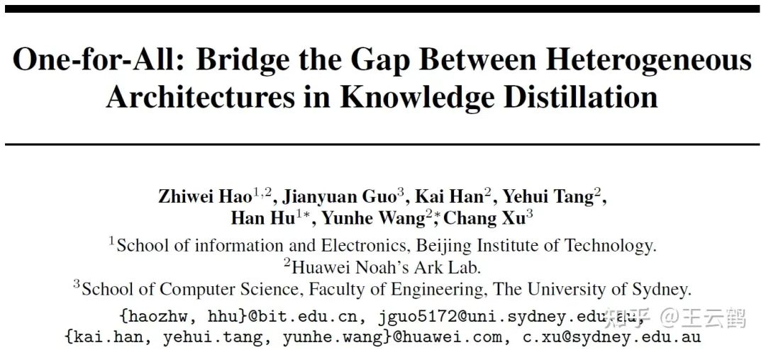 The researchers analyzed the differences in the features of heterogeneous models (such as CNN, ViT, and MLP) and concluded that the architecture-related information in the features hinders the process of KD. Based on the analysis, the researchers proposed a KD method for heterogeneous models called one-for-all KD (OFA-KD). This method maps features to a unified space that is architecture-independent for conducting heterogeneous model knowledge distillation, and uses a loss formulation that can adaptively enhance the target information. On CIFAR-100 and ImageNet datasets, this method surpasses the existing homogeneous-architecture KD methods.