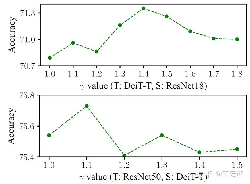 The above figure compares the impact of different value settings on the result on ImageNet. It can be seen that by selecting a proper value setting, the improved KD loss formulation can obtain a better result than that of the original KD loss formulation.