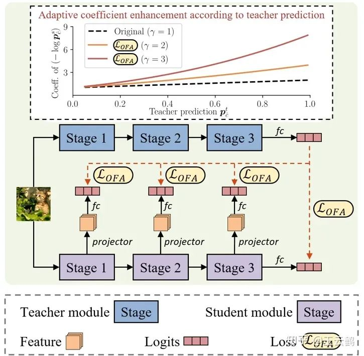 In order to utilize intermediate features during the distillation of heterogeneous models, it is necessary to eliminate the interference caused by the architecture-related information in the features and retain only task-related information. Therefore, the researchers proposed to filter the architecture-related information by mapping the intermediate features of the student model to the logits space. In addition, an additional adjustment coefficient is added into the KL divergence-based loss formulation, so that the modified loss formulation can adaptively enhance the target information, thereby further filtering interference caused by irrelevant information during distillation of heterogeneous models.