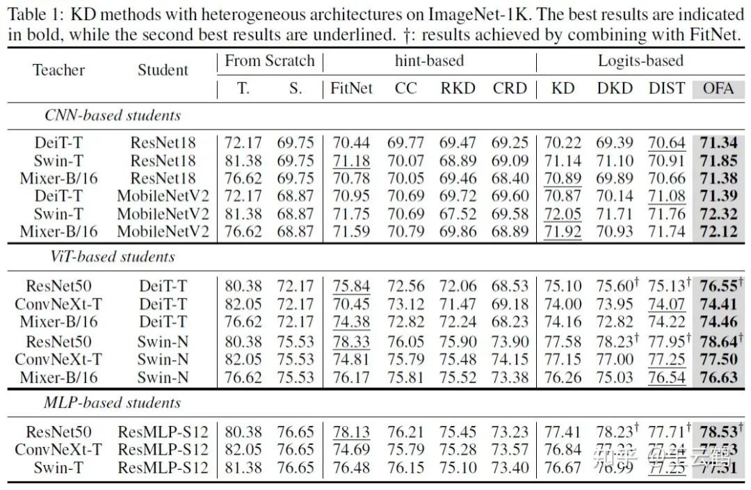 In this blog, we have studied the KD methods of heterogeneous models. We can map the intermediate features of student models to the logits space to fit teacher models for a final output, and use a loss formulation that can adaptively enhance the target information which is an improvement based on the original KD loss formulation. The proposed OFA-KD surpasses the existing methods on multiple datasets and among multiple teacher-student model combinations, expanding the application scope of knowledge distillation.
