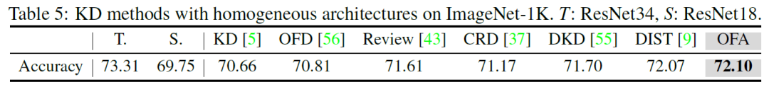 In this paper, OFA-KD is compared with traditional KD of homogeneous models on ImageNet. In terms of the distillation for the homogeneous combination of ResNet34 and ResNet18 teacher and student models, OFA-KD also has the similar performance as SOTA.