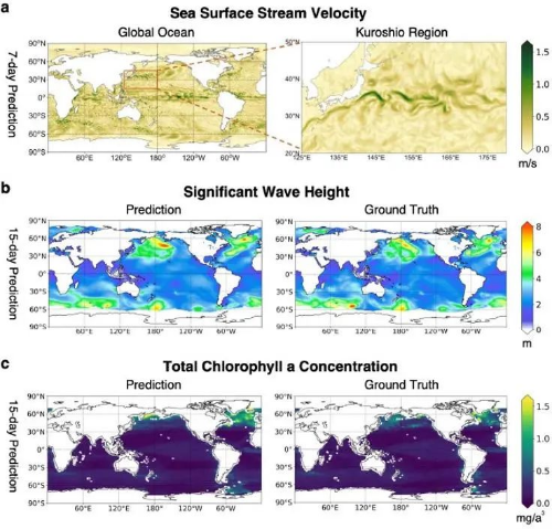 Figure 2 Prediction results of AI-GOMS downstream tasks (a: downscaling result in Kuroshio , taking the sea surface stream velocity as an example; b: wave height; c: chlorophyll concentration)