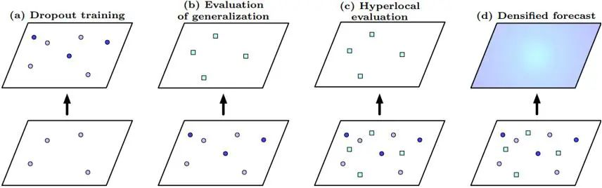 In recent AI weather forecast models, such as Graphcast and Pangu-Weather model, reanalysis data is used as training samples, that is, the data after assimilation through background fields and observations. Compared with these medium-term forecasting models, MetNet-3 introduces some atmospheric observation data for model training and evaluation. However, the observation data differs from the reanalysis data because the source of the observation data varies and is heterogeneous, which has different degrees of sparsity. To fuse atmospheric observation data (sparse data in dots), MetNet-3 uses a method called Densification. Densification directly fuses data assimilation and simulation prediction in the AI model. Figure 1 shows the Densification process.