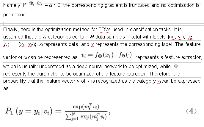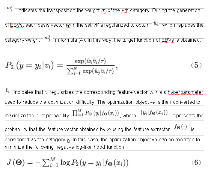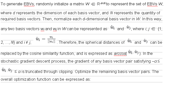 As we know, d orthogonal basis vectors can construct a d-dimensional Euclidean space R_d_. In addition, two orthogonal vectors are not correlated in mathematics. However, such d-dimensional space accommodates a maximum of d basis vectors, that is, the number of categories to be accommodated N = d. Memory space cannot be reduced for large-scale classification. Therefore, the angle relationship between different basis vectors needs to be optimized. It is assumed that in the unit hypersphere S__d ∈ R_d_, α ∈ [0, 1), and the angle range of any two basis vectors is defined as [arccos – α, arccosα]. For the given category quantity N, find the minimum value of α that meets the requirement; or for an acceptable α, find the value range of N in the space R_d_. This is how EBVs are defined. Its mathematical expression can be summarized as finding a set of EBVs W that meets the requirement, and W satisfies: